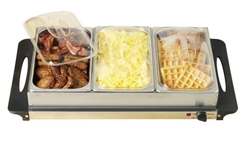 Ideal for entertaining during any special event, this three-section buffet and warming-tray unit offers an array of conveniences. The buffet warmer keeps main courses, side dishes, or desserts at a warm serving temperature. Its three, individual, stainless, 2-1/2-quart chafing dishes hold 20 4-ounce servings each, and come with matching clear PC (polycarbonate) lids that lift easily thanks to the indentations on top. The chafing dishes fit inside the unit's pan holder, which can be removed for using the base as a stand-alone warming tray. The warming tray provides a durable stainless-steel heating surface and three variable heat controls (low, medium, and high) that range from 130 to 185 degrees F. In addition, it comes equipped with two cool-touch handles and four non-skid feet for stability. Plus it's easy to clean--simply wipe down with a damp cloth. The buffet and warming-tray unit measures 25-1/2 by 15 by 8 inches and carries a 90-day limited warranty.