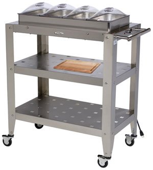Large 30-5/8" x 18" stainless top warming surface (active heat area: 27-5/8" x 15"). 2 wheels with brakes; 2 wheels without. 2 lower storage shelves. Stainless steam pan holder attaches securely to cart. Cart ships assembled; just attach wheels. 4.3 qt. chafing pans hold up to 40 four oz. servings ea. Stainless top (pan holder & pans) removable; can use top level of cart as warming tray. 72" (6') long cord w/ cord storage slot. 3-prong commercial SJTO cordset. UPS-able. Safety signal light. Includes: Four 4.3 qt. chafing pans. Four clear individual lids. One 7" x 13" maple cutting board.