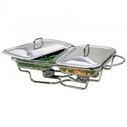 Includes two heat resistant 1.9qt glass dishes that fit side by side in the chrome metal frame with votive candle holders. Includes two surgical stainless steel lids for the glass dishes. Glass dishes are oven and microwave proof and dishwasher safe. Put together overall size (including handles) is 17-1/2" x 6" x 12". Limited lifetime warranty. Gift boxed.
