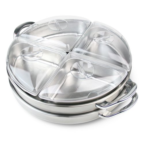 This revolving Deluxe Lazy Susan Buffet and Warming Tray server is great for entertaining at any special event. With the buffet warmer you main courses, side dishes or desserts will stay warm for one hour after cord is detached. It comes with four individual stainless steel chafing dishes which hold 1.5 quarts. Each dish come with clear dome PC lids. Each stainless steel chafing dish fits inside the pan holder, which can be removed so you can use the stainless steel warming tray alone. The stainless steel heating surface is durable and easy to clean with two cool-touch handles.