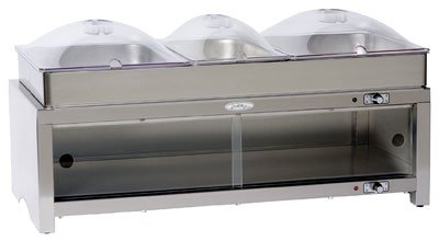 Top level of cabinet functions as a family size buffet server - two 4.3 qt. chafing pans & one 2.6 qt. chafing pan; clear polycarbonate lids with utensil slots included. 4.3 qt. pans hold up to 40 four oz. servings; 2.6 qt. pans hold up to 25 four oz. servings. Stainless steel chafing pan holder conserves heat & keeps pans aligned on top warming surface. Lower cabinet may be used as a plate / food warmer - holds up to 12 large plates! (plates not included). Two adjustable thermostats (one per level): 155° to 205° F. Commercial quality as used in leading hotels. Top level is 27-5/8" x14" stainless warming surface. Patent Pending.