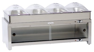 Top level of cabinet functions as a family size buffet server - four 2.6 qt. chafing pans; clear polycarbonate lids with utensil slots included. 2.6 qt. pans hold up to 25 four oz. servings. Stainless steel chafing pan holder conserves heat & keeps pans aligned on top warming surface. Lower cabinet may be used as a plate / food warmer - holds up to 12 large plates! (plates not included). Two adjustable thermostats (one per level): 155° to 205° F. Commercial quality as used in leading hotels. Top level is 27-5/8" x14" stainless warming surface. Patent Pending.