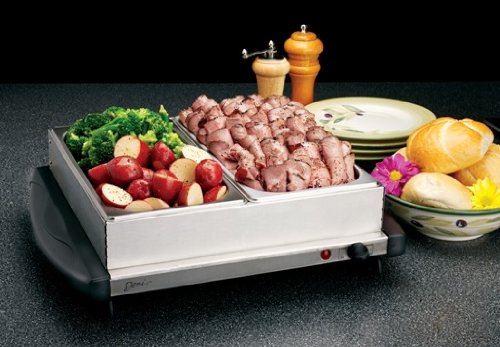 Perfect for holidays, patio parties or family gatherings! For people who like to entertain, Deni introduces the Dual Buffet Server. This appliance keeps food hot, fresh and ready to serve whenever your guests are ready. The stainless steel serving trays can be removed revealing a stand alone warming tray. Keep casseroles warm right from the oven or heat up tasty hor d oeurves. (PATENT PENDING) Features: Stainless steel buffet server Food stays hot, fresh and ready to serve Two removable stainless steel serving trays (2.5 quarts each) Converts to a warming tray with 192.5 sq. in. of warming surface Capacity for 40 (4 oz) servings No open flames Adjustable thermostat with three temperature settings (Low 155 F, Med 175 F, High 200 F) Keeps food at a safe serving temperature Even heat distribution Cool touch handles and non-skid feet