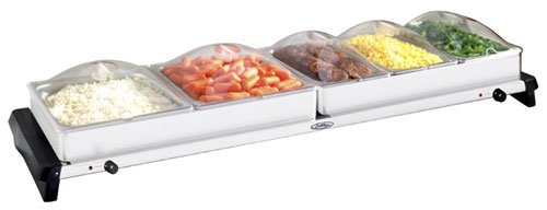 Professional Grand Buffet Server. Generous 41-1/4???x14??? Stainless Warming Surface. Five pans: Two 4.3 qt. stainless chafing pans; each holds up to 40 four oz. servings, plus Three 2.6 qt. stainless chafing pans; each holds up to 25 four oz. servings. Five clear polycarbonate lids with utensil slots. Two stainless chafing pan holders keep pans on tray and conserve heat. Chafing dish holders removable; can use base as warming tray. Variable heat control - 155 to 200 F. Two separate heat controls - one for each level of unit. Safety signal lights. Stylish Cool-Touch handles. Easy to clean warming surface. 4 non-skid feet. 3 prong commercial cord set. Two-year warranty. UL Listed. 120 Volts - 600 Watts - 5 Amps.Foods should be fully cooked and already hot before being placed on Buffet Servers, which are designed for keep-warm function only. Our steam pans (pans only, not the lids) may be used to cook/heat foods to serving temperature in an oven,and then covered and transferred to the warming tray base for keep-warm.Ships in 2 cartons