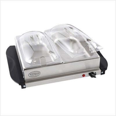 Nostalgia Electrics BCD-222 Features: -Mini buffet server and warming tray. -Each dish fits inside the pan holder, which can be removed. -Includes two individual chafing dishes. -Each chafing dish holds 1.5 quart approx 10 servings. -Three variable heat controls with low, medium and high settings . -Base can be used as stand alone warming tray. -Two chafing pans, clear polycarbonate lids. -The warming tray has two cool touch handles, four non stick feet that offer stability. -It is durable. Specifications: -Stainless steel construction. -Easy to clean. -Nostalgia Electrics provides a 90 day warranty. -Overall dimensions: 6.75" H x 11.25" W x 16.5" D. Please Note: This item cannot ship to Puerto Rico. We apologize for the inconvenience. If you would like assistance finding an item that can ship to Puerto Rico, please contact our customer service team.